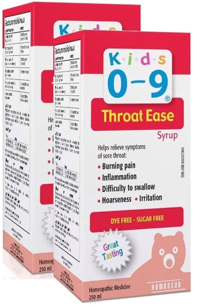 Homeocan - Kids 0-9 Throat Ease - 100 Millilitre(s) - NPN: 80037395 -- Kids 0-9 Throat Ease Syrup homeopathic medicine to help relieve symptoms of sore throat: burning pain, inflammation (mucus), difficulty to swallow, hoarseness, irritation, redness. DYE FREE SUGAR FREE GREAT TASTING